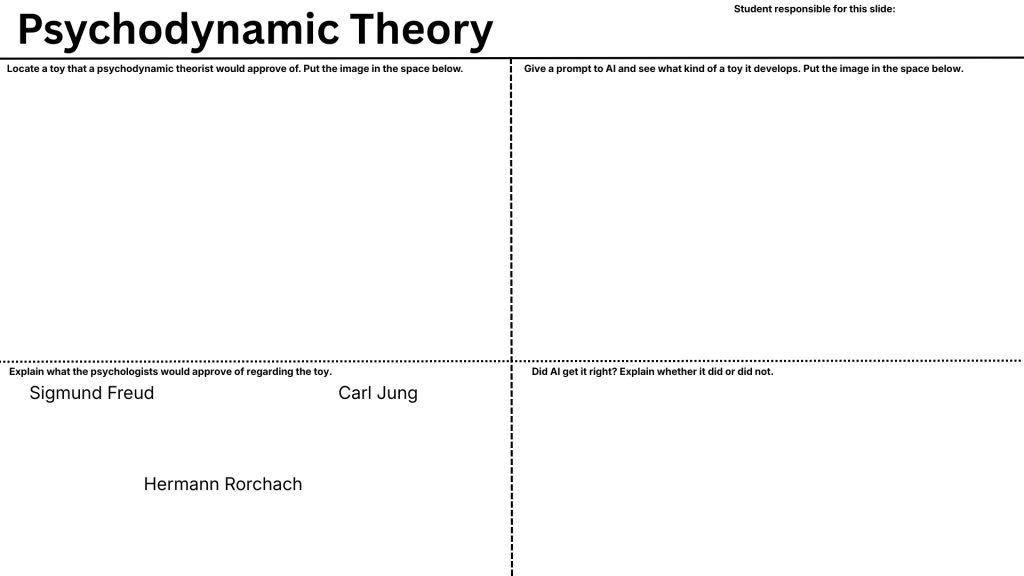 On the following day, the students will then be locating a toy that specifically meets the needs of the psychologists in their school of thought. They will locate a picture and then explain their choice. All of this is compiled by the group on a Google Slide. A new addition I’ve just added is having AI create the toy. After being provided with appropriate prompts that are reflective of the school of thought and psychologists, the students will ask the AI to visually create a toy that the psychologists would be happy with. They will then add the image and write about whether they believe that toy is a good representation of their school of thought.