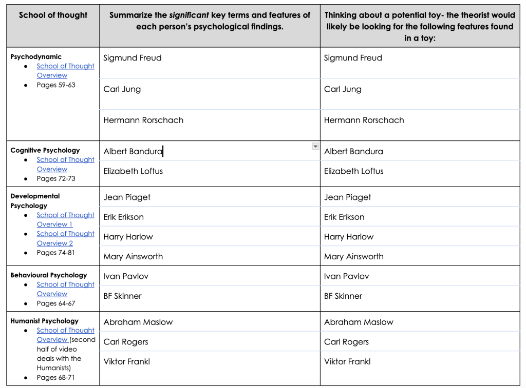 In consolidating students’ understanding of the psychological schools of thought in HSP3U, over the course of two 75 minute periods, I have the students in groups review the different psychologists and their findings. They use videos from Crash Course and the textbook “Social Science: An Introduction” by OHASSTA executive Jan Haskings to summarize the key terms into a graphic organizer. Each group member is responsible for compiling the information for one of the schools of thought.
